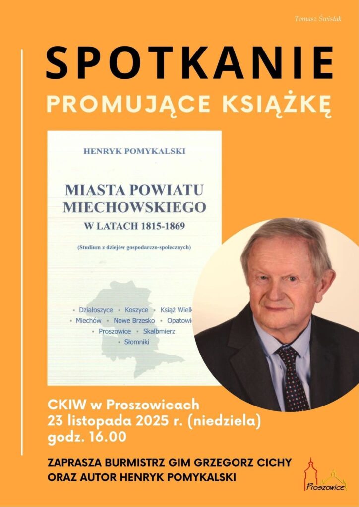 Na godzinę 16.00 w niedzielę w Centrum Kultury i Wypoczynku w Proszowicach zaplanowano promocję najnowszej książki Henryka Pomykalskiego „Miasta Powiatu Miechowskiego w latach 1815 – 1869”.