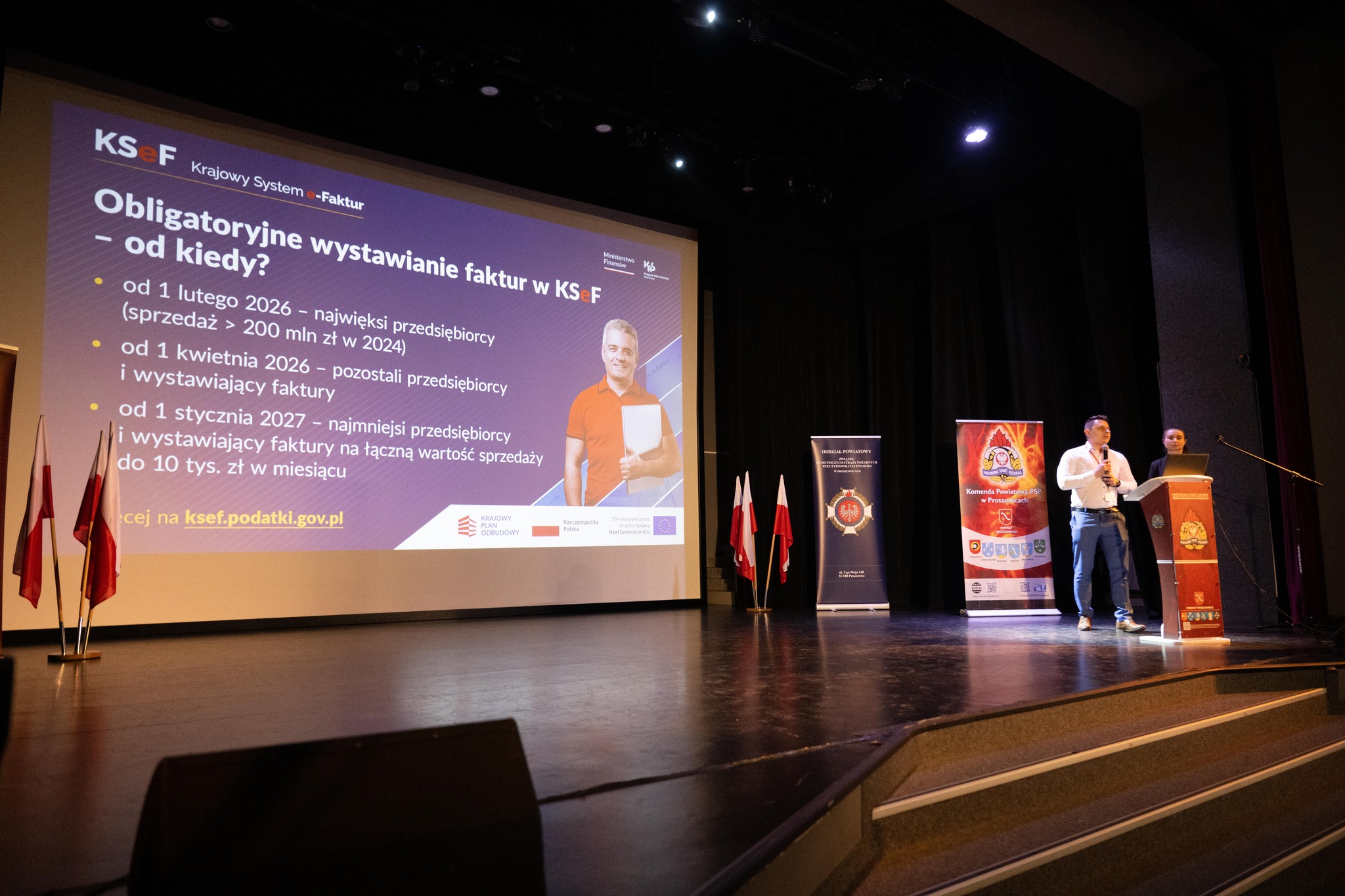 Strażacy oraz zaproszeni goście mogli również skorzystać z punktów informacyjnych zlokalizowanych przed aulą, przygotowanych przez współpracujące służby i instytucje. Stoiska umożliwiały bezpośrednie konsultacje, uzyskanie materiałów informacyjnych oraz omówienie bieżących spraw organizacyjnych i formalnych.