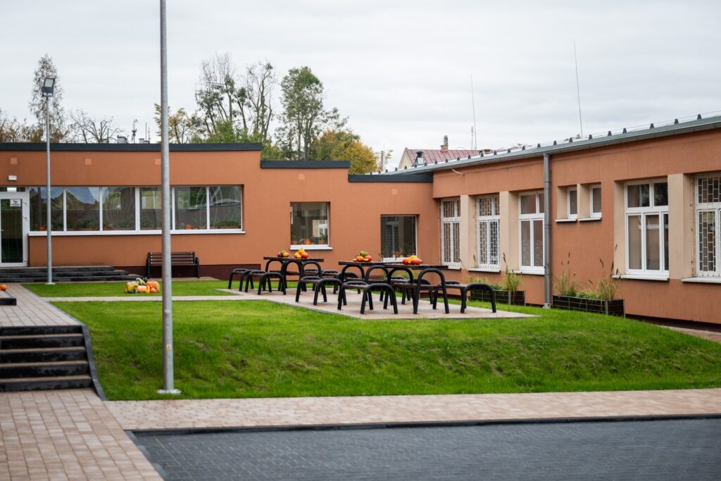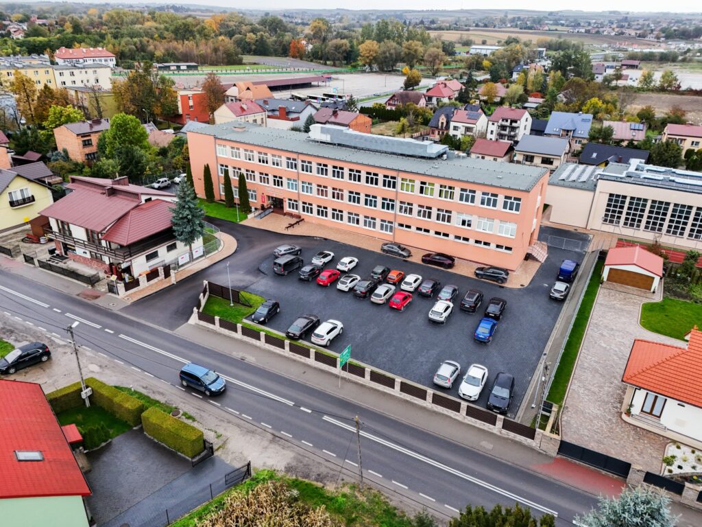 Całość dopełniły nowe chodniki, ogrodzenie i energooszczędne oświetlenie zewnętrzne , dzięki którym szkoła zyskała nowe, nowoczesne oblicze .