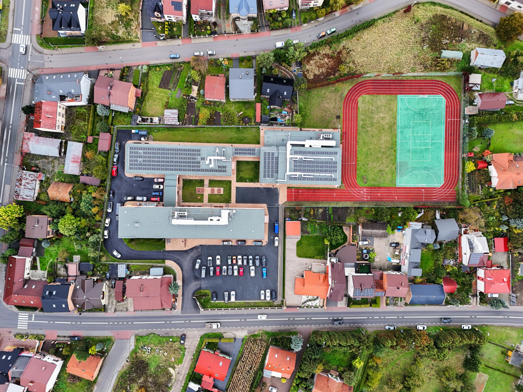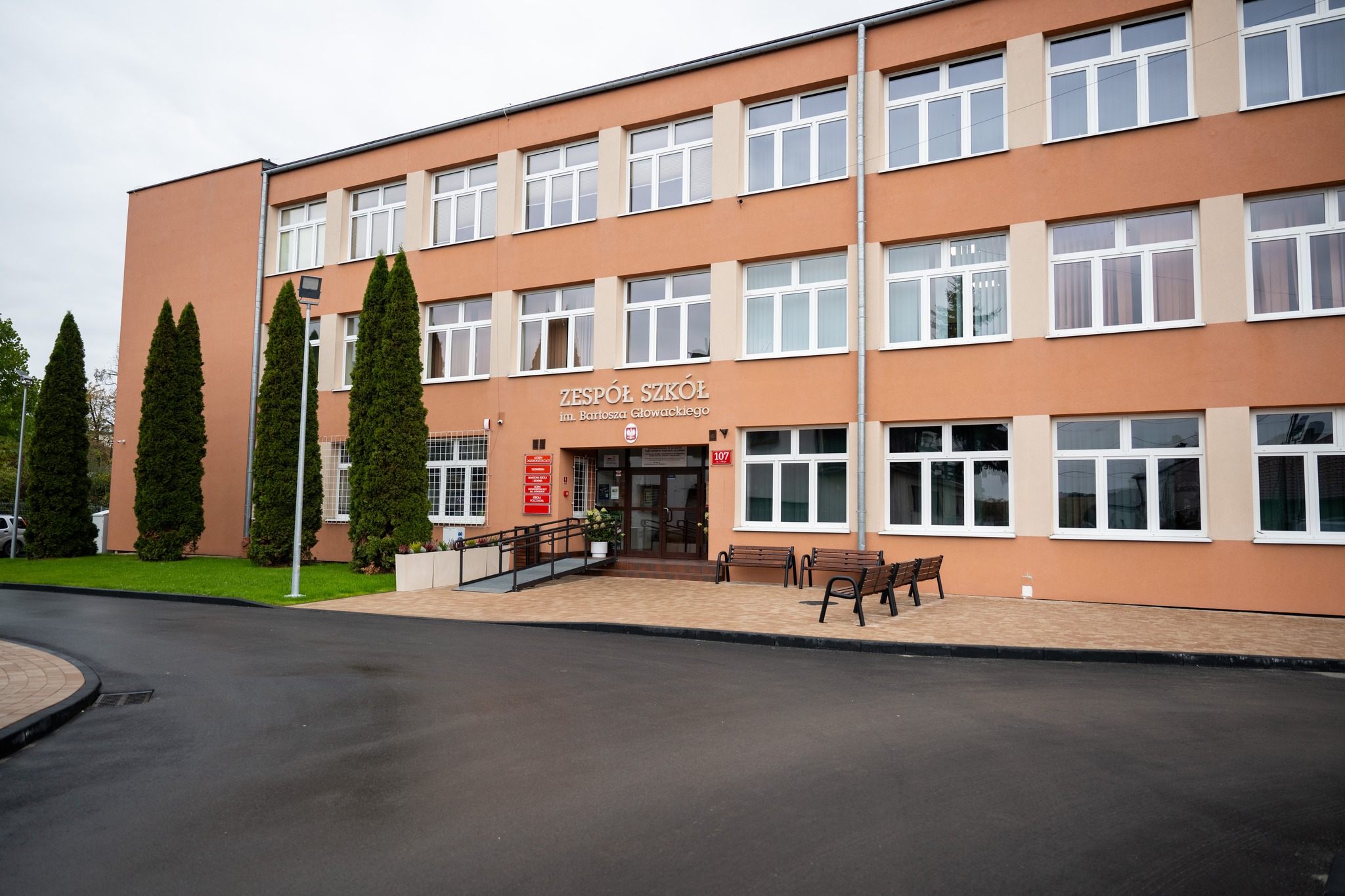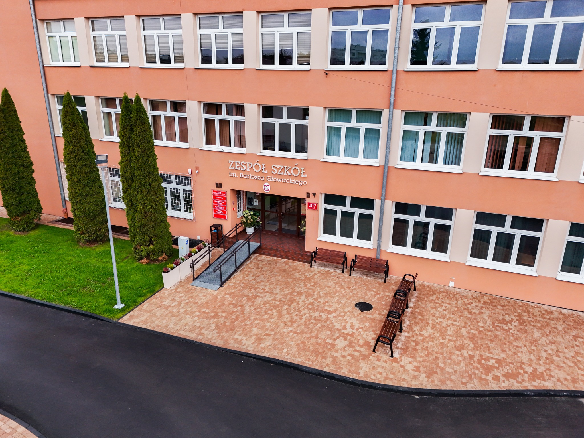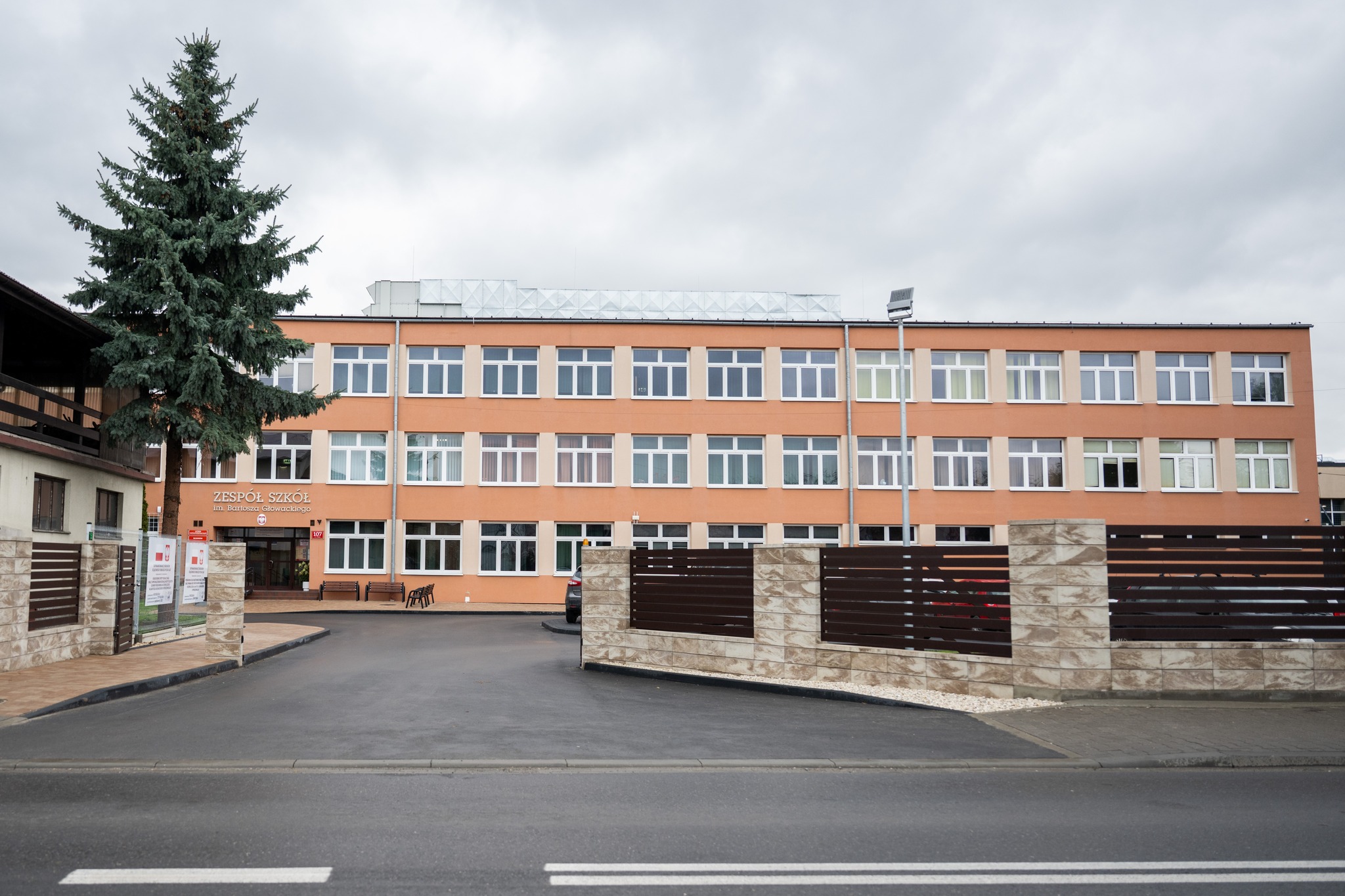 Całość dopełniły nowe chodniki, ogrodzenie i energooszczędne oświetlenie zewnętrzne , dzięki którym szkoła zyskała nowe, nowoczesne oblicze .