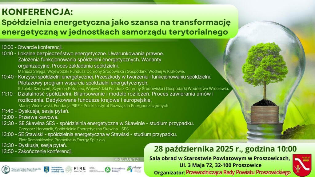 We wtorek 28 października o godz. 10.00 w sali narad Starostwa Powiatowego w Proszowicach zaplanowano konferencję „Spółdzielnia energetyczna jako szansa na transformację energetyczną w jednostkach samorządu terytorialnego”. Organizatorem wydarzenia jest Przewodnicząca Rady Powiatu Proszowickiego.