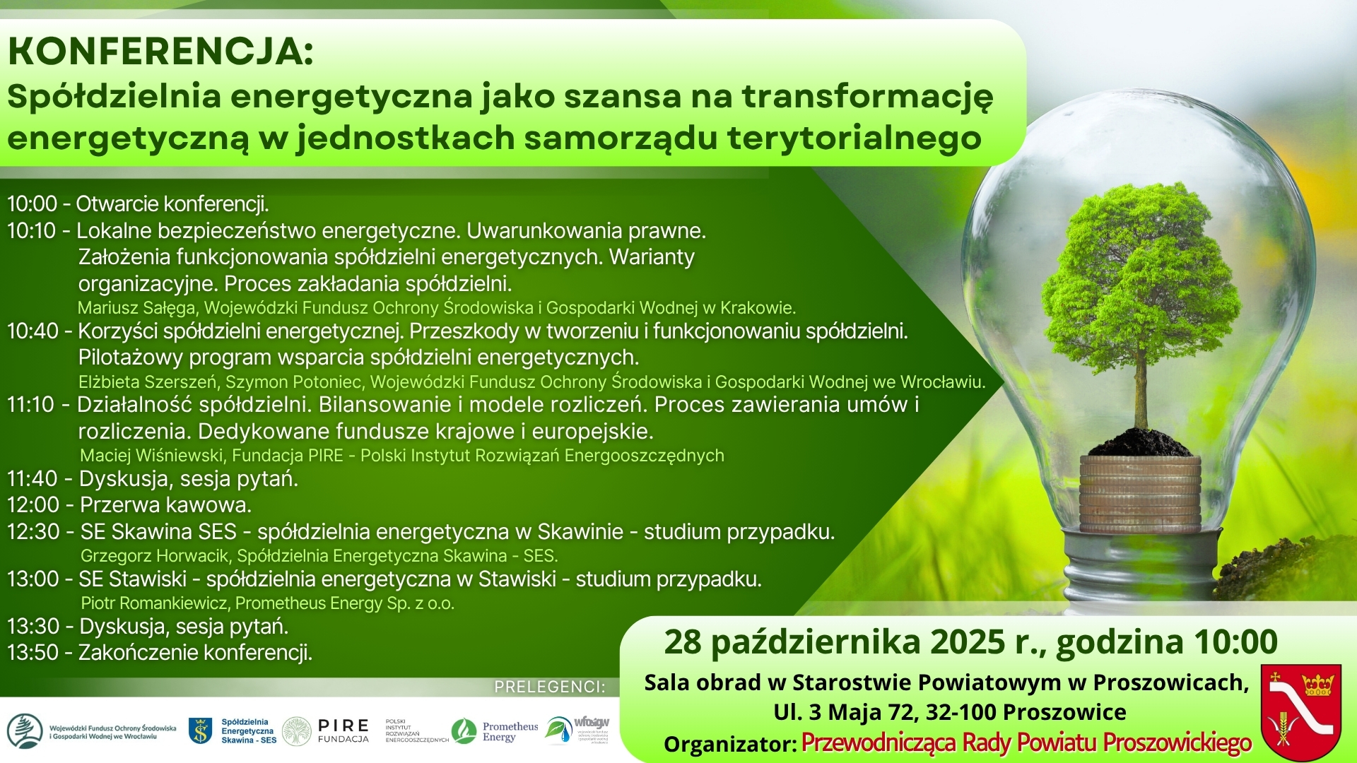 We wtorek 28 października o godz. 10.00 w sali narad Starostwa Powiatowego w Proszowicach zaplanowano konferencję „Spółdzielnia energetyczna jako szansa na transformację energetyczną w jednostkach samorządu terytorialnego”. Organizatorem wydarzenia jest Przewodnicząca Rady Powiatu Proszowickiego.